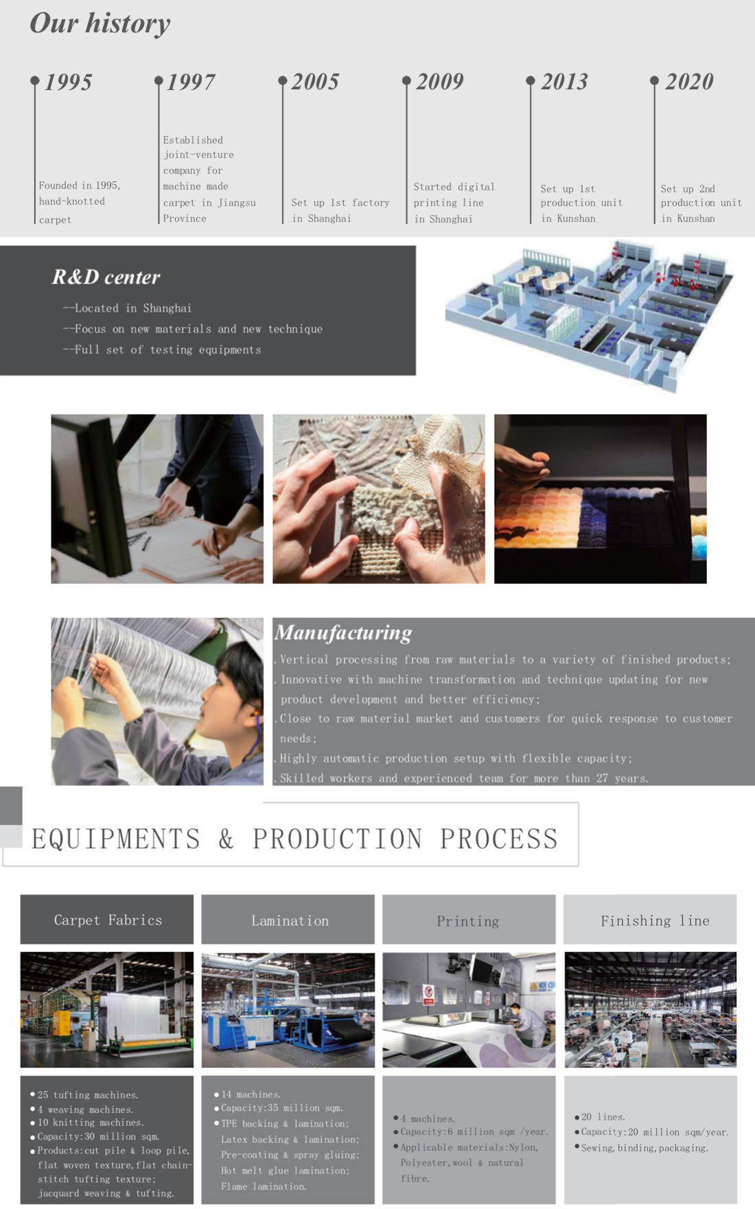 卡比特家饰地毯是一家独立开发、设计、生产、销售于一体的地毯制造商。拥有3家分公司,年产值近8亿元,企业员工约600人。拥有60余项发明和实用新型专利。行业首家应用数码喷印技术,荣获“专、精、特、新”企业称号。中国家用机织地毯十大品牌等荣誉称号。国家高新技术企业。江苏省省级企业技术中心。苏州市企业技术中心。昆山市科技研发中心。